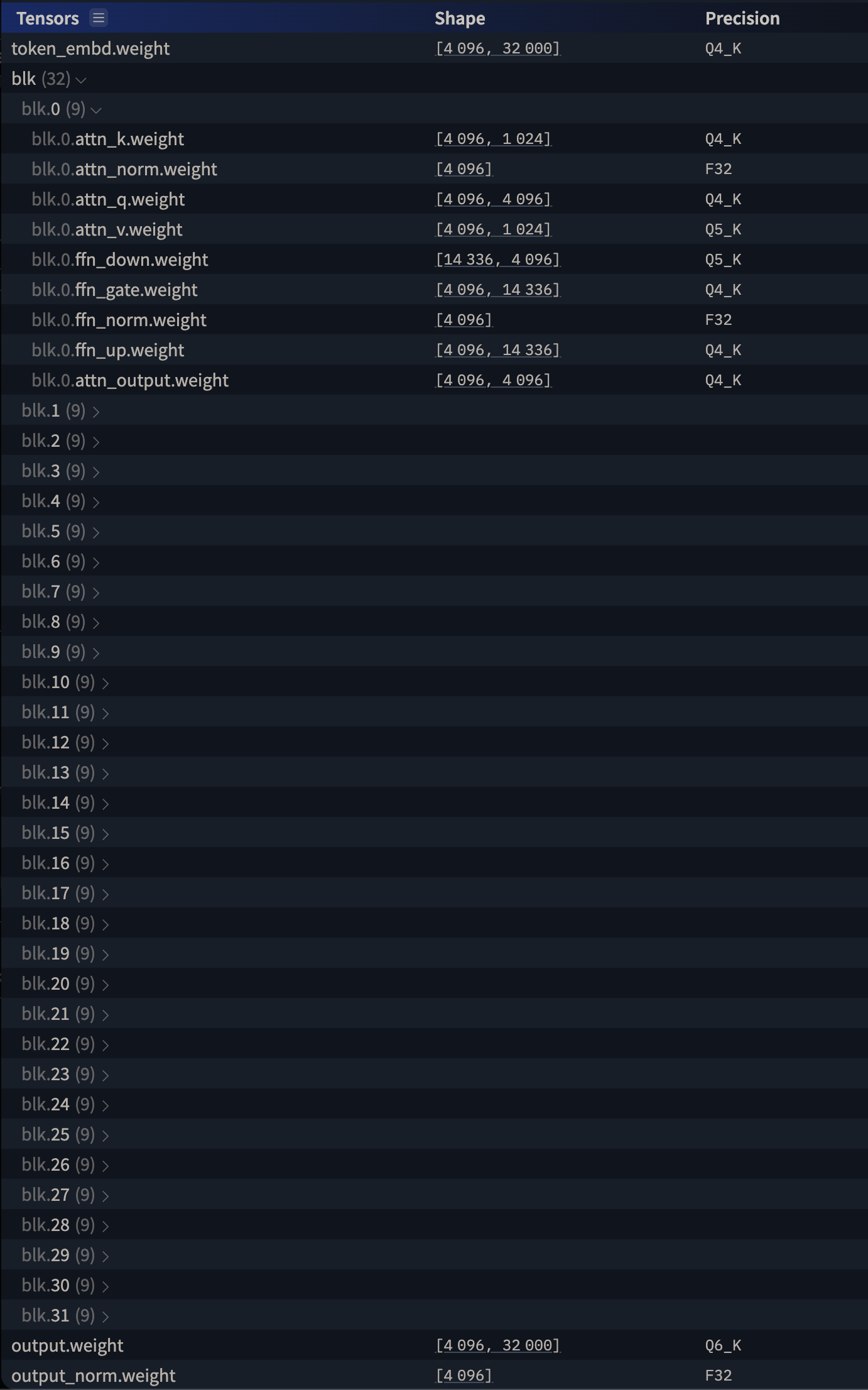 Powyżej widzimy wewnętrzną strukturę “wiedzy” modelu Bielik w konkretnej wersji. O architekturze wewnętrznej LLMów mówię bardzo dużo w Developerze Jutra – ale w dużym skrócie – ta “wiedza” to fizycznie (między innymi) wspomniane wcześniej tensory (macierze, wektory itp) która w architekturze Transformers jest “upakowana” warstwowo. I każda warstwa składa się najpierw z atencji (w różnych smakach, kolorach i odcieniach), a potem z feed-forward neural networks (FFN), która – przynajmniej wzorcowo – jest typową sztuczną siecią neuronową (ANN).